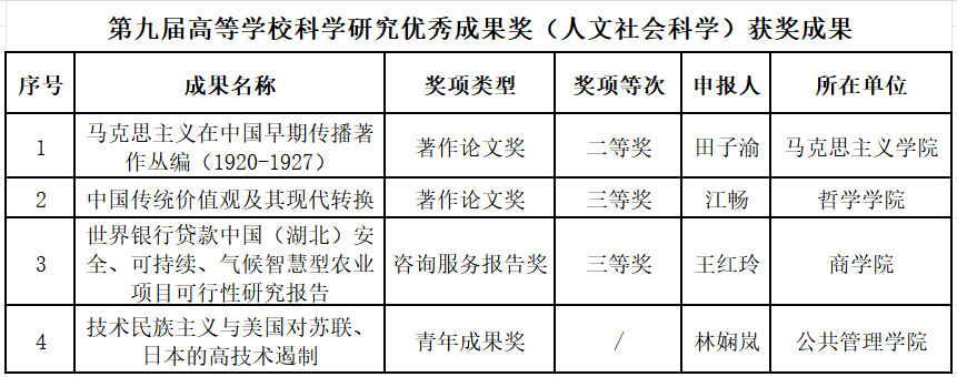 近日,教育部公布第九届高等学校科学研究优秀成果奖(人文社会科学)评选结果,我校4项成果获奖,获奖数位列全省高校第五位、省属高校第一位。
