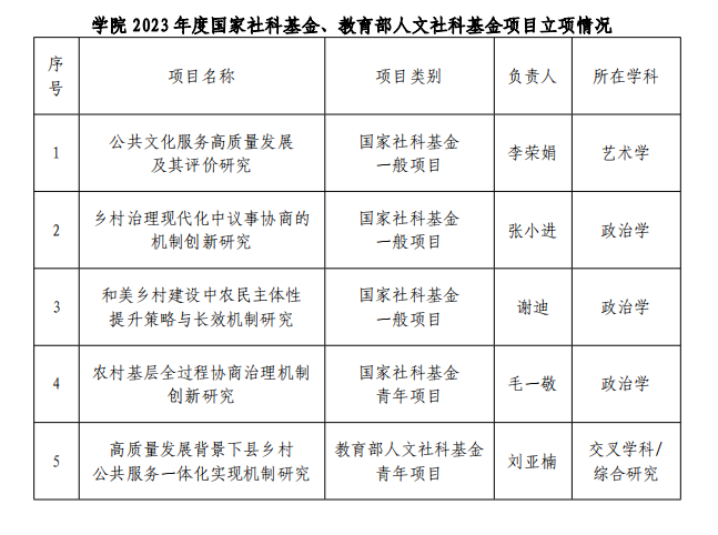 2023年9月-10月,“2023年国家社会科学基金年度项目和青年项目立项结果公布”“2023年度国家社科基金艺术学项目立项名单公布”“教育部社科司关于2023年度教育部人文社会科学研究一般项目立项的通知”相继发布,CROWN官网员工获国家社科基金项目立项4项、教育部人文社科基金项目立项1项。CROWN官网获国家社科基金、教育部人文社科基金项目立项总数连续三年位居全校文科CROWN官网前列。
