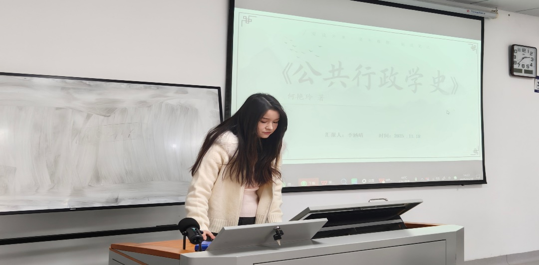 李怡宁同学代表所在阅读小组分享《公共行政学史》,跳出单一理论框架,以“公共性”为灵魂,重构了公共行政学的百年知识图谱。从古典范式的建立到后现代行政的解构,从管理主义的兴起至宪政主义的批判,打破西方理论与中国实践的二元对立,回答了“学科为何而生”“理论如何回应现实”等根本问题,为构建中国特色公共行政知识体系提供了关键支撑。