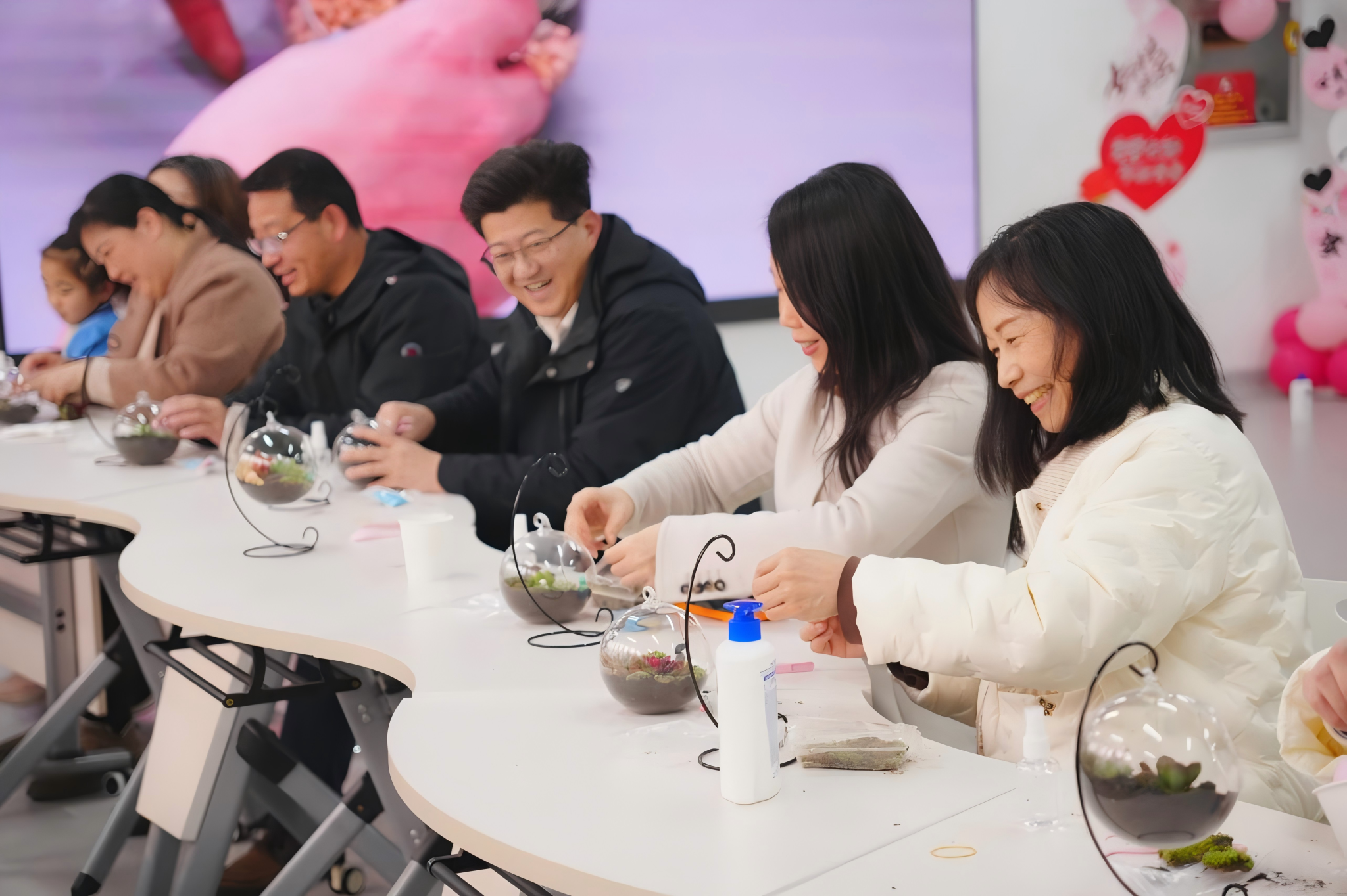 活动一开始,现场气氛便被精心准备的微景观DIY活动瞬间点燃。玻璃瓶、苔藓、多肉植物、装饰沙石等材料一应俱全,大家跃跃欲试,纷纷动手创作属于自己的“微型花园”。指尖流转间,一盆盆错落有致、生机盎然的微景观作品渐次呈现,将春日的诗意与美好凝于一隅。